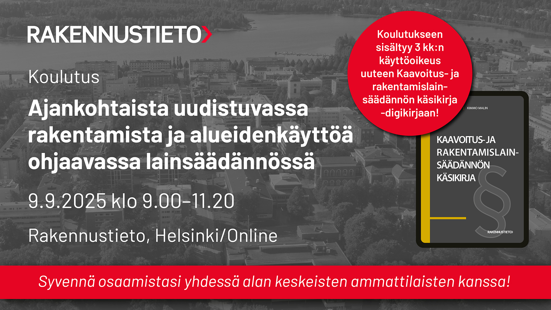Tilaa webinaaritallenne. Lisäksi saat 3 kk:n käyttöoikeuden Kaavoitus- ja rakentamislainsäädännön käsikirja -digikirjaan. Tallenne tilattavissa 30.9.2025 asti ja katsottavissa 15.12.2025 asti.